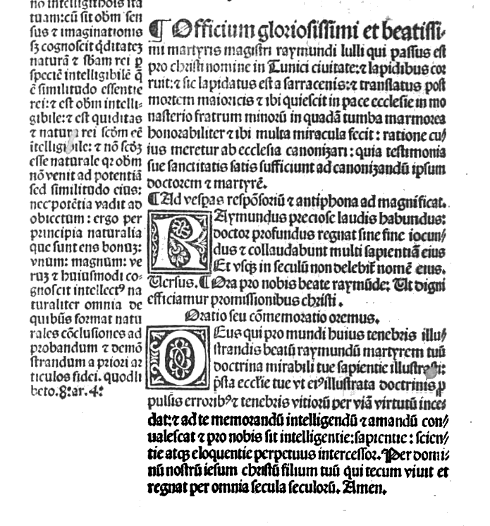 Segle XVI. Jaume Gener (Janer),[1] en la seva compilació de les doctrines lul·lianes Ars metaphysicalis naturalis ordinis cuiuslibet rei intelligibilis (València: Lleonard Hutz, 1506), inclou un “Officium gloriosissimi et beatissimi martyris magistri Raymundi Lulli qui passus est pro Christi nomine in Tunici civitate […]” al foli CCLXXXII.