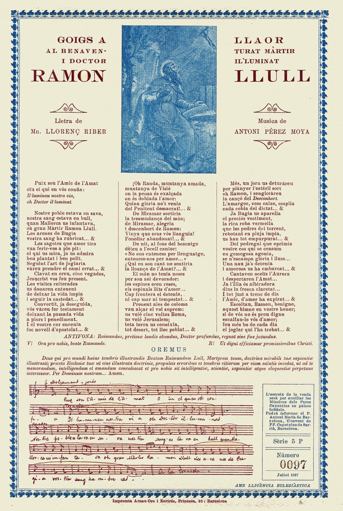Llorenç Riber, Goigs a llaor al benaventurat màrtir i doctor il·luminat Ramon Llull. Lletra de Mn… Música de Antoni Pérez Moya. Barcelona: Arnau-Ors i Bartrés, Princesa 23, 1927. [Sèries i edicions diverses dins del mateix any d’edició, amb orles diferents]