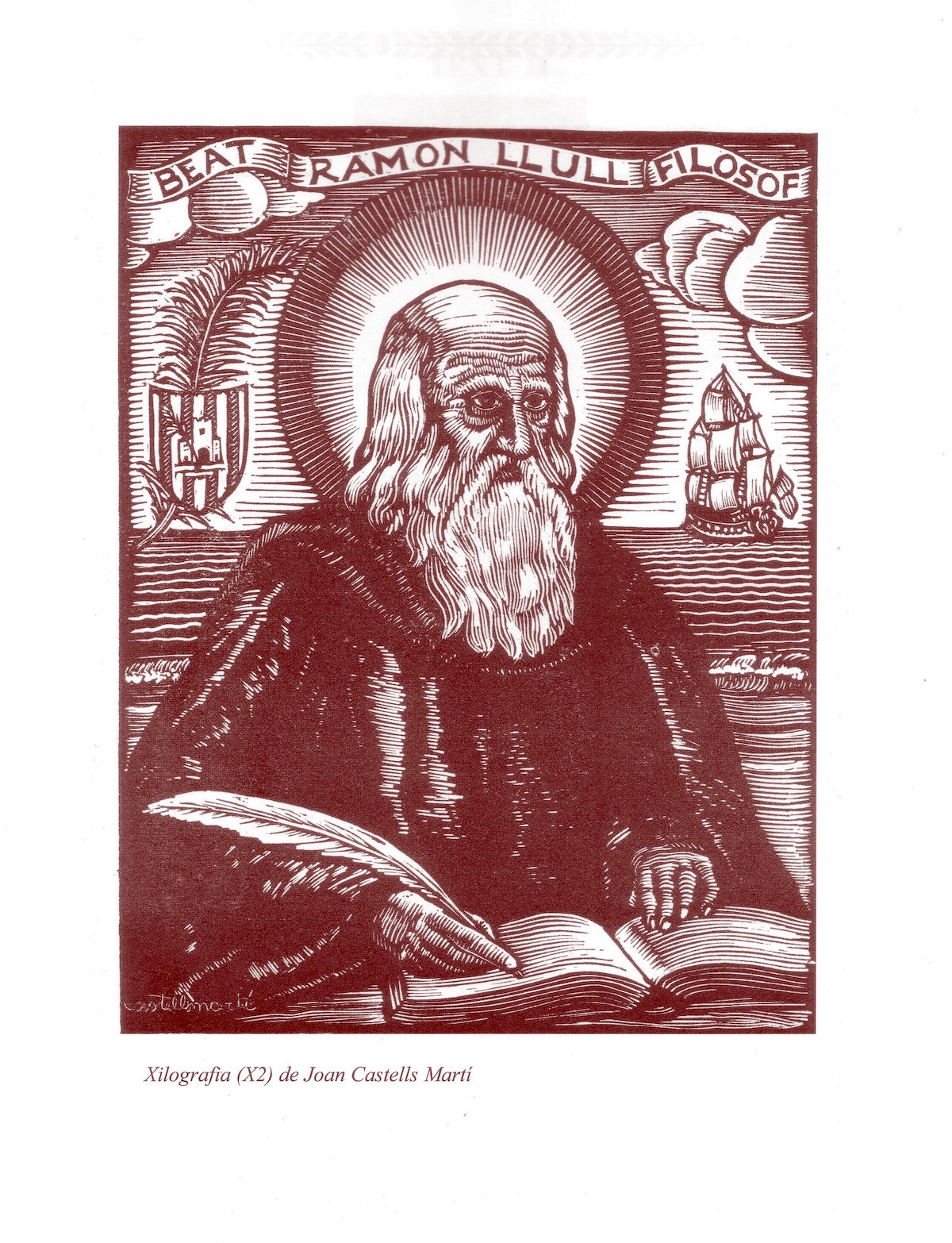 Hem començat dient que aquests goigs van ser publicats en paper fil, en una presentació molt exclusiva. Doncs bé, aquesta oferta editora incloïa un foli encartat amb tots els goigs publicats on s’oferia un dibuix original de gran mida, en alguns casos firmats pels artistes. En el cas present, l’obra triada va ser una xilografia del gravador Joan Castells i Martí[5] que representava el “Beat Ramon Llull filòsof”, segons que posa la mateixa estampació. Artista reconegut en l’art de treballar la fusta, va formar part, al seu moment, del grup d’artesans establerts al Poble Espanyol de Barcelona.[6]