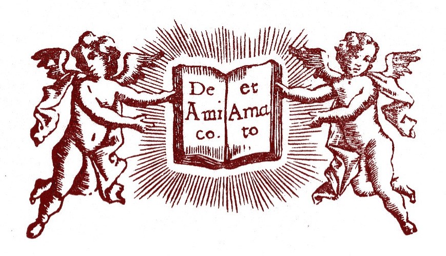 Una bonica xilografia separa la partitura de la nota històrica comentada. Representa “Dos angelets del tipus tenant, sostenen un llibre el qual apareix voltat de raigs, les seves pàgines estan escrites amb el seu títol: ‘De Amico et Amato’… se l’ha relacionat aquest gravat amb les xilografies de l’impremta Guasp”.[7]