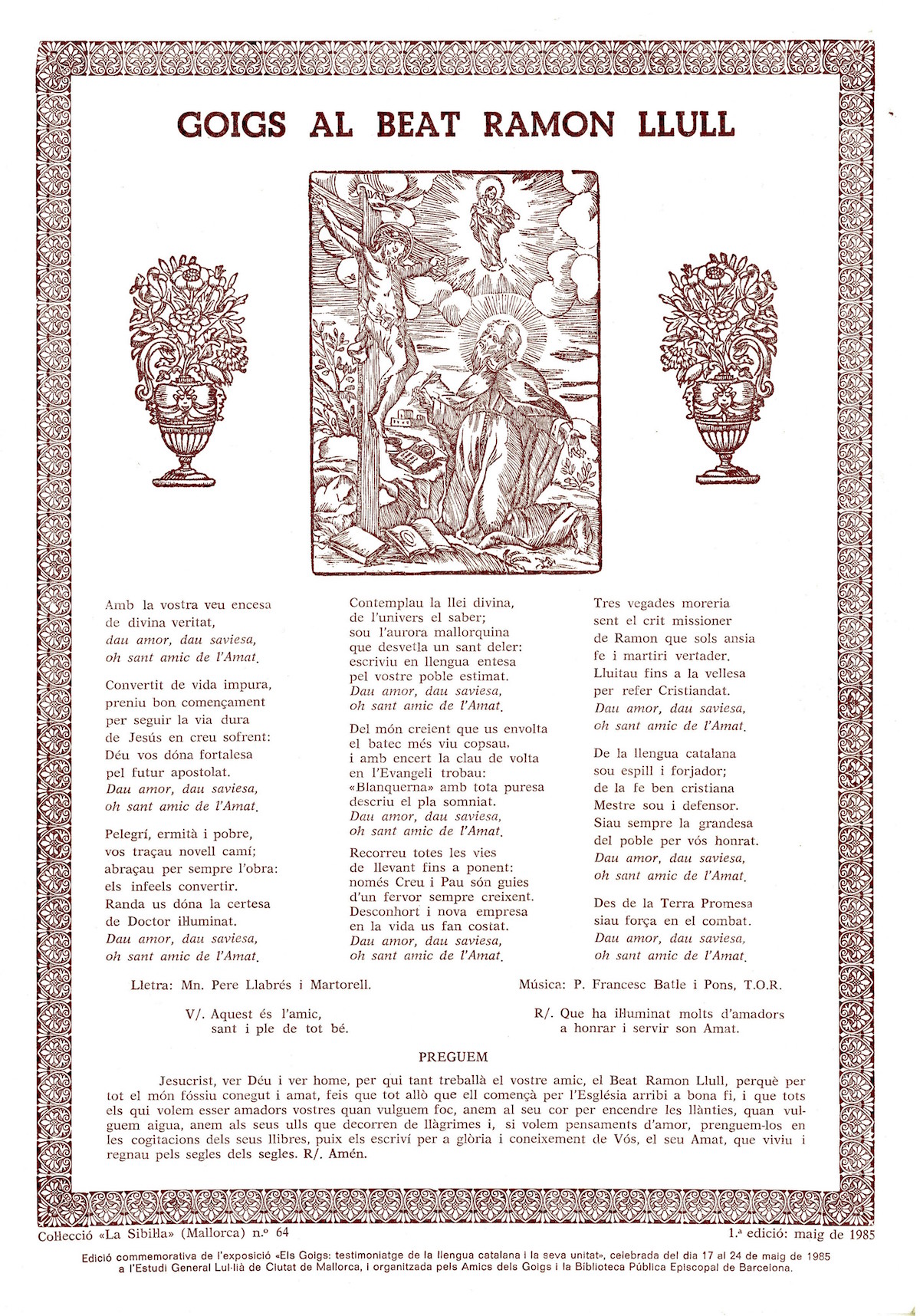 ramon-llull-27xi-goigs-1985bLa “Nota històrica” va firmada pel doctor Josep Amengual i Batle[5] (n. 1938), superior de la Congregació de Missioners dels Sagrats Cors. Dedica el seu escrit a repassar la vida del beat en breu pinzellades molt orientatives. Diu que “la llengua catalana assolí un grau insospitat de maduresa dins la seva immensa producció literària”, i cita els títols de les obres seves següents: Ars Magna, Blanquerna, Llibre de l’Amic i Amat, Arbre de Filosofia d’Amor, Llibre de Contemplació, Llibre del Gentil i dels tres savis i Doctrinal pueril. Acaba amb la vella i constant reivindicació de la causa lul·liana que hem vist des dels primers goigs del segle XVIII: “que es vegi coronat un procés de canonització ja secular”