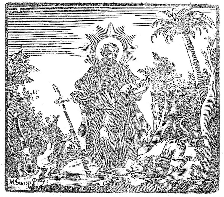 En aquest gravat podem veure representat l’episodi de l’encontre de l’Amic amb dos lleons, mentre mirava de trobar el seu Amat. Al bell mig, en una clariana del que sembla un bosc molt espès –on entre arbres i arbusts poc definits hi destaca una palmera–, veiem Llull entre dos lleons mansois, un d’agenollat i l’altre dret, amb la llengua fora –tal com ho faria un gos amistós. Tot i la bellesa del gravat, no hi sé distingir cap llentiscle.
