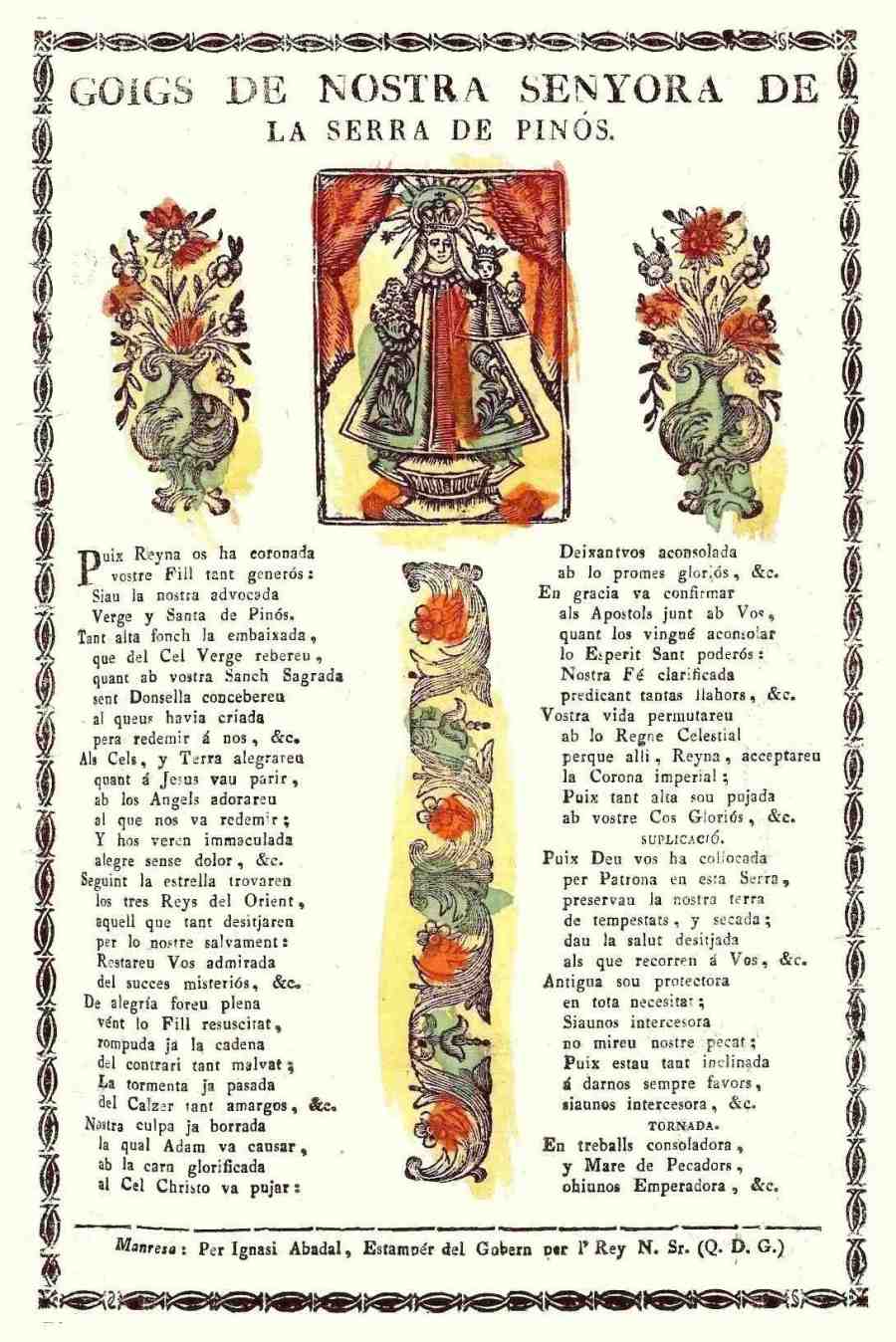 ♣ Goigs de Nostra Senyora de la Serra de Pinós, Manresa: Ignasi Abadal, s. a. [Acolorit a mà, la xilografia és reproduïda a l’edició de 1949 del Jardín de Maria de Narcís Camós][6]