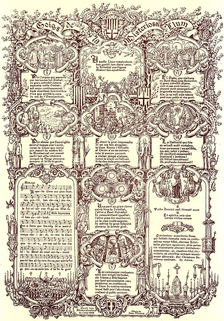 A diferència dels goigs del Carme, dels quals no ens ha arribat cap partitura, com s’ha dit abans, dels goigs de la Llum oferim aquí la música tradicional inclosa, en aquest cas, als Goigs de la Misteriosa Llum, edició dels Administradors, dibuixos de Joan Vilanova (Manresa: Impremta de San Josep, 1948).