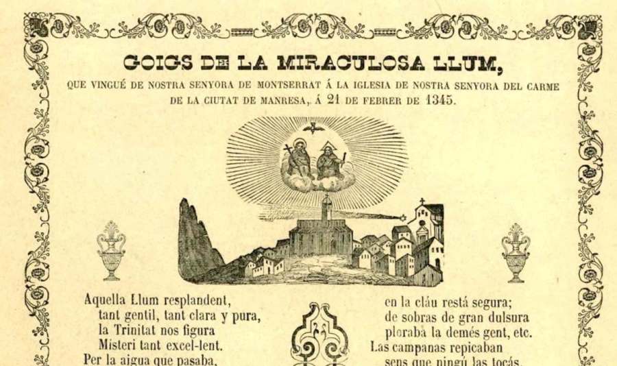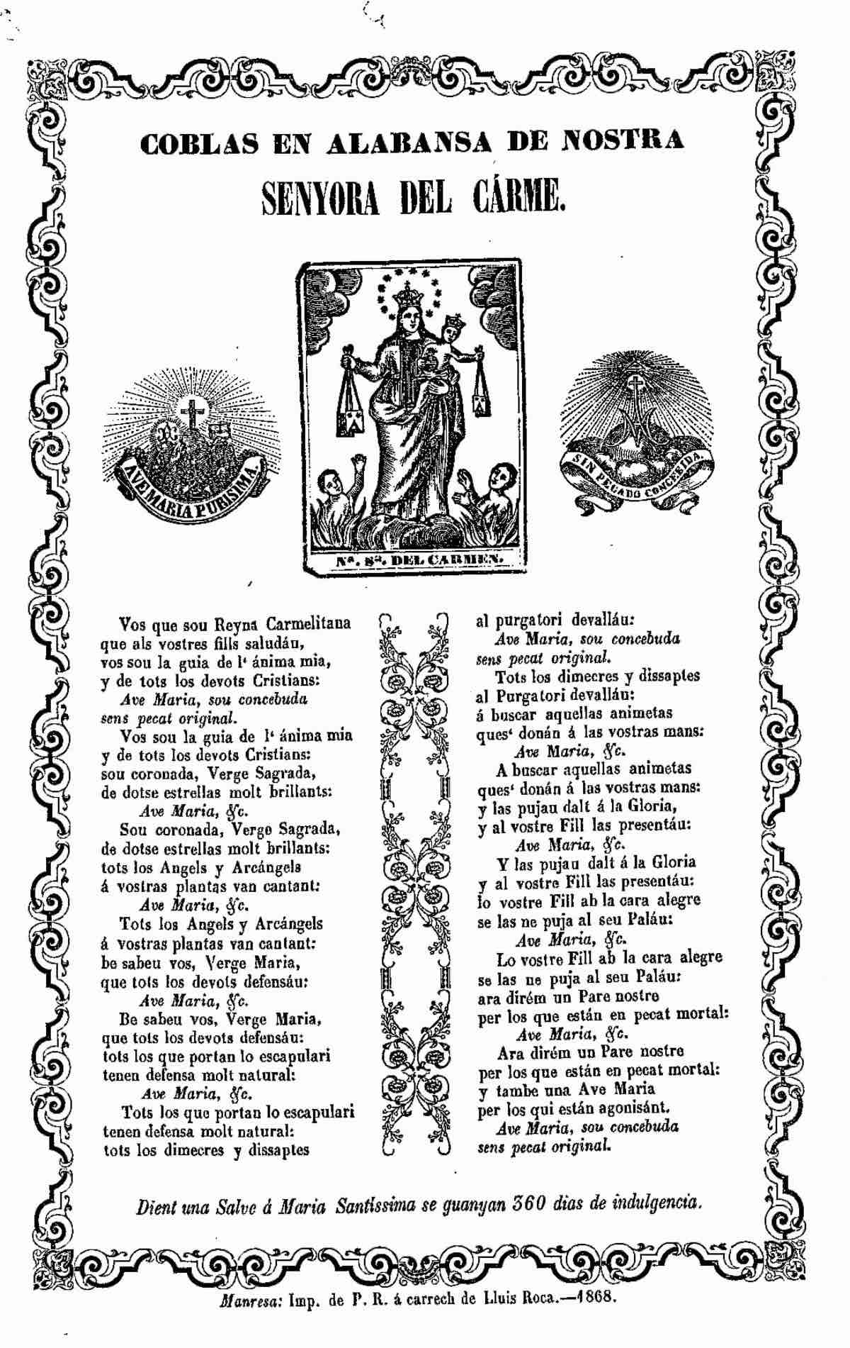 ♥ Coblas en alabansa de Nostra Senyora del Carme, Manresa: Imp. de P.R. á carrech de Lluís Roca, 1868. [Floró al·lusiu a la miraculosa llum]