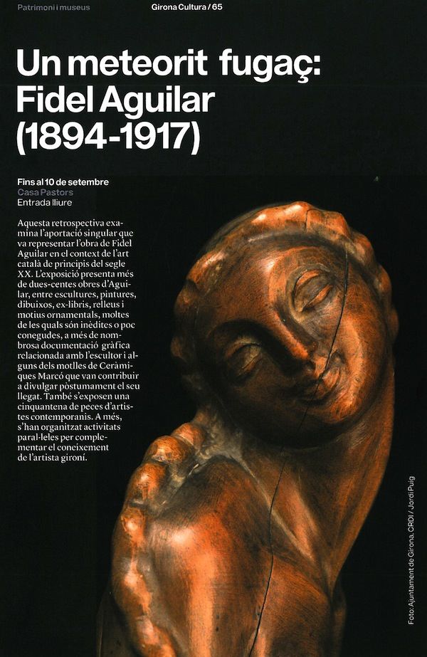 Com moltes altres persones d’arreu del país, he visitat amb plaer l’exposició antològica que sobre Fidel Aguilar, coincidint amb el centenari de la seva mort, s’ha organitzat per l’Ajuntament de Girona a la Casa Pastors d’aquesta ciutat, amb el títol: Un meteorit fugaç: Fidel Aguilar (1894-1917). L’exposició presenta més de tres-centes escultures, dibuixos, exlibris i talles en fusta o pedra –amb un gran nombre d’obres desconegudes o inèdites–, a més de relleus i motius ornamentals d’un artista gironí que va morir massa jove, que no va tenir temps de madurar, però que tenia una veu pròpia, molt acusada, un estil reconegut, en una derivació del Noucentisme imperant. Les seves primeres obres són de 1913. Moltes de les seves peces, volgudament naïfs, reflecteixen estats d’ànim individuals. El catàleg que s’ha editat a cura d’Eva Vàzquez, historiadora de l’art i comissària de l’exposició, és també una peça esplèndida. No venia, però, a parlar-vos sobre el significat i la rellevància de l’obra d’un artista avançat en el pas del Modernisme al Noucentisme. Sobre aquesta temàtica hi ha especialistes que en saben més que jo. Llegiu per exemple la ressenya que sobre aquest artista ha publicat Francesc Fontbona a El Temps (4 de juliol de 2017).