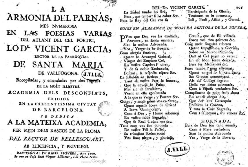 ♥ Vicent GARCIA, “Goigs en alabansa de nostra senyora de la Bovera”, dins La armonia del Parnàs […] del atlant del cel poetic lo Dr. Vicent Garcia, rector de la parroquia de Santa Maria de Vallfogona […], Barcelona: Rafael Figueró, 1700, p. 203, però 260.