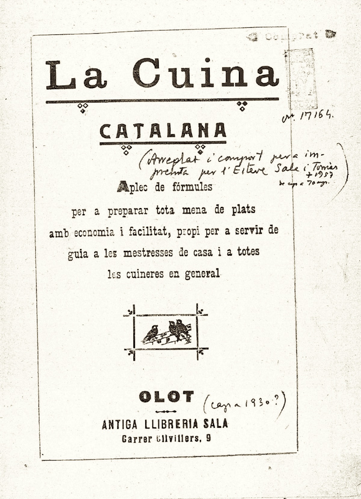 Pels volts de 1930, el llibreter olotí Esteve Sala Tomàs,[1] del qual malauradament no puc aportar cap dada biogràfica ni bibliogràfica, publicava el fulletó: La cuina catalana. Aplec de fórmules per a preparar tota mena de plats amb economia i facilitat, propi per a servir de guia a les mestresses de casa i a totes les cuineres en general.[2] Aquesta col·lecció de fórmules culinàries va merèixer l’atenció d’una estudiosa, Maria Àngels Anaya, que en va publicar un article a la revista La Comarca d’Olot,[3] en el qual reproduïa comentades algunes d’aquestes receptes.