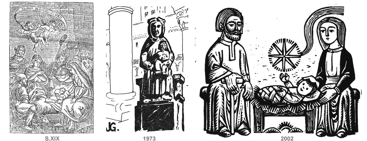 Diferents són els gravats que els acompanyen: una xilografia comuna al primer goig del segle XIX, i dos de bonics inclosos en els últims. Un, firmat per Jeroni Giralt, on la imatge queda emmarcada en un racó del claustre amb el campanar de fons, i el tercer ofereix una partitura, una “Petita nota històrica” i un dibuix que reprodueix la talla de la marededéu de Cuixà; presideix la seva pàgina principal un gravat nadalenc atractiu i modern.
