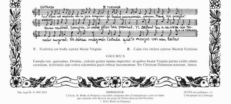 ♦ Goigs en alabança de Nostra Senyora del Pessebre venerada a la cripta de l’antiquíssim monestir de Sant Miquel de Cuixà, 2a edició de l’original, enriquida amb melodia pròpia que acompanya el cant dels goigs. 8 de setembre de 2002, L’Hospitalet de Llobregat: Altés arts gràfiques, 2002. 2 p. “Puix d’eixa vall regalada / sou la joya singular:”