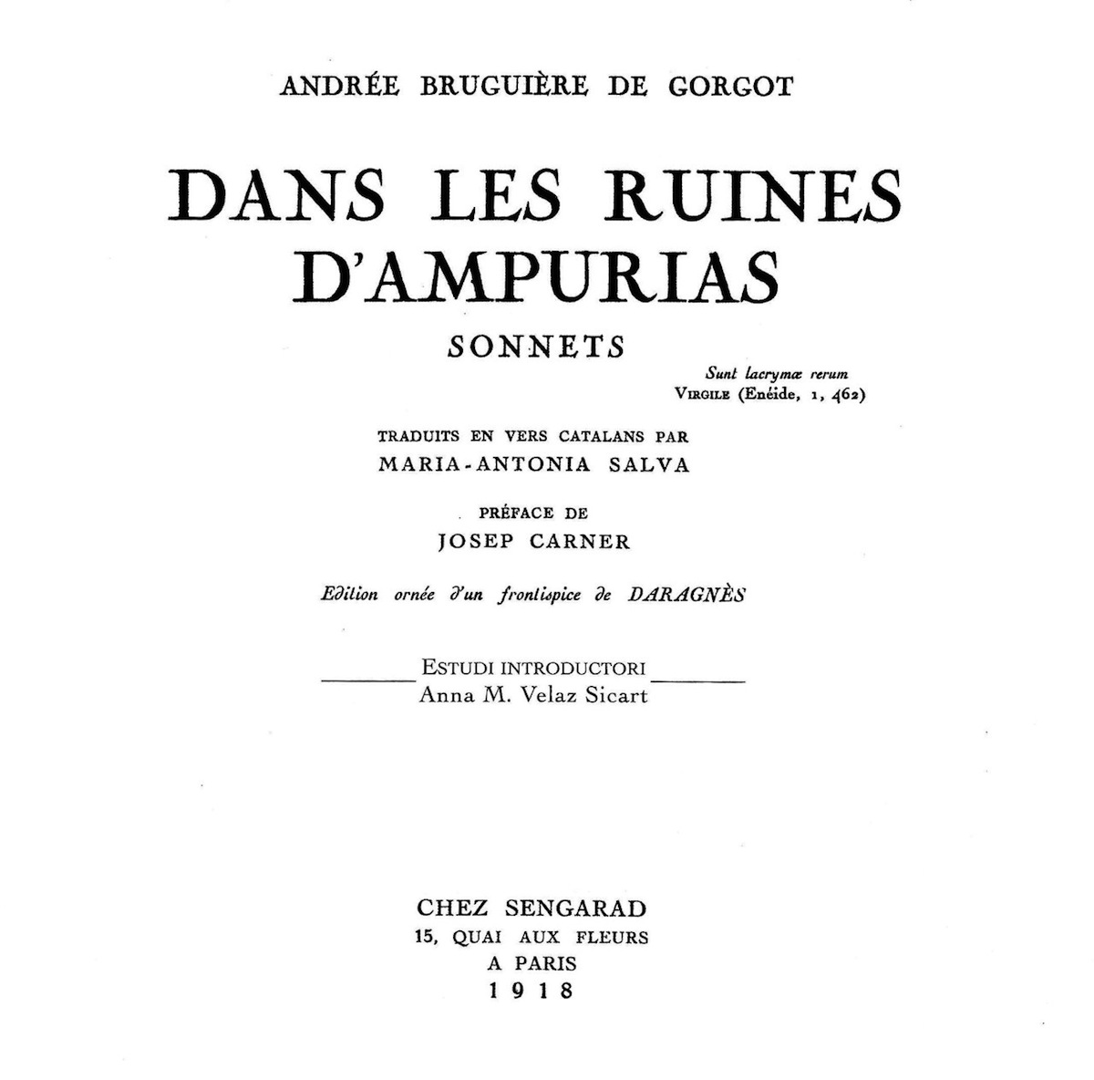Les Edicions Vitel·la, des de Bellcaire d’Empordà, han tingut l’encert de reeditar amb un acurat estudi d’Anna Maria Velaz Sicart, l’edició facsímil del pulcre llibre, introbable, d’Andrée Bruguière de Gorgot (1892-1941) Dans les ruines d’Ampurias (París, 1918), format per quaranta-dos sonets escrits en francès, amb la versió catalana, arcaïtzant, acarada, de l’escriptora mallorquina Maria Antònia Salvà, amb un pròleg de Josep Carner, que dirigia i corregia les passes d’aquesta mallorquina, traductora també de Mistral. El llibre conté també un frontispici acolorit del pintor francès Daragnès a més de sis clixés d’època, quatre de les ruïnes d’Empúries, un del convent dels servites, avui seu del Museu, i un altre del port de la vila. Des d’un punt de vista tipogràfic, el llibre mereix també tots els honors.