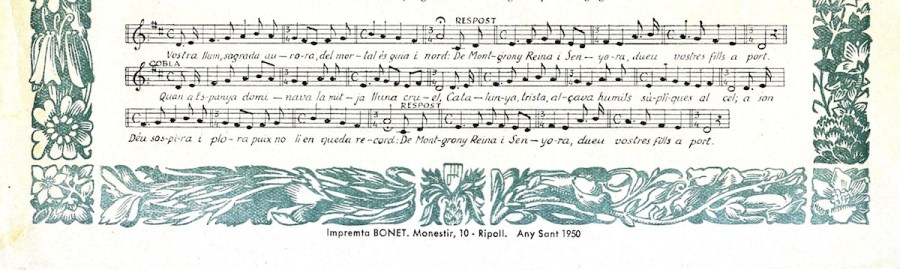 ◊ Goigs de Santa Maria de Montgrony dita també de la Llet que es venera a la parròquia de Sant Pere de Gombreny, del bisbat de Vic, Lletra popular revisada, Ripoll: Imprenta Bonet, Monestir, 6., 1971. [Al revers, gravat xilogràfic en color amb la inscripció “Ntra. Sra. de Montgrony”]. “Vostra llum, sagrada aurora, / dels mortals és guia i nord: / De Montgrony, oh gran Senyora, / dueu vostres fills a port”. [Amb partitura, a dues tintes]