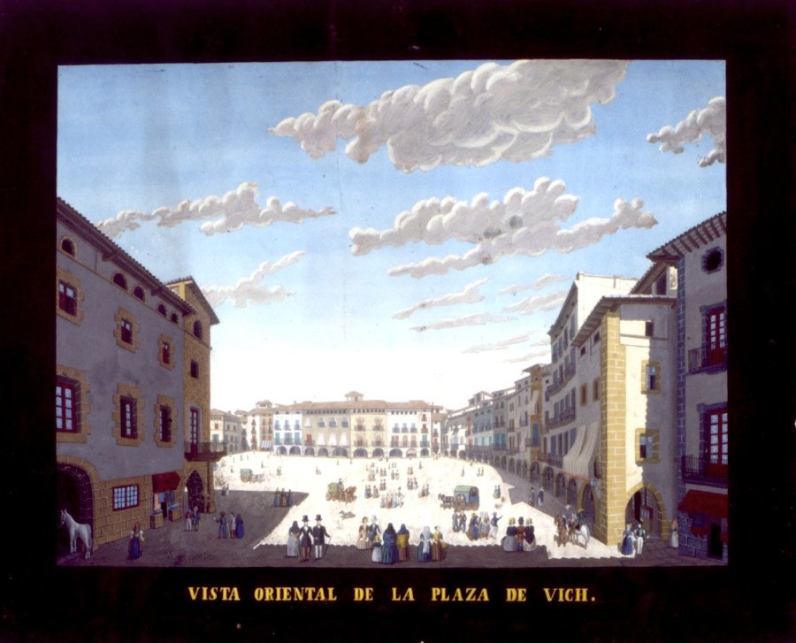 Tot i que Vic tenia fama de ciutat grisa, aquestes imatges acolorides, potser un xic idealitzades, li lleven el seu hermetisme, li donen un aire de ciutat italiana, amb unes façanes renovades. De fet, des de llavors, els barris històrics de Vic, a redós de la plaça, tampoc no han canviat tant. La plaça Major de Vic sempre ha estat lloc de trobada, de reunió i de mercat. Aquí hi veiem gent endiumenjada que passeja amb la “lleugera seda de sarges i davantals”, grups de famílies, nines, fadrins, més d’un vell caminant amb bastonet, animals, carruatges, tartanes, edificis porxats. Són els versos d’un poeta local, Joaquim Capdevila Lleona, nascut a Vic l’any 1823: