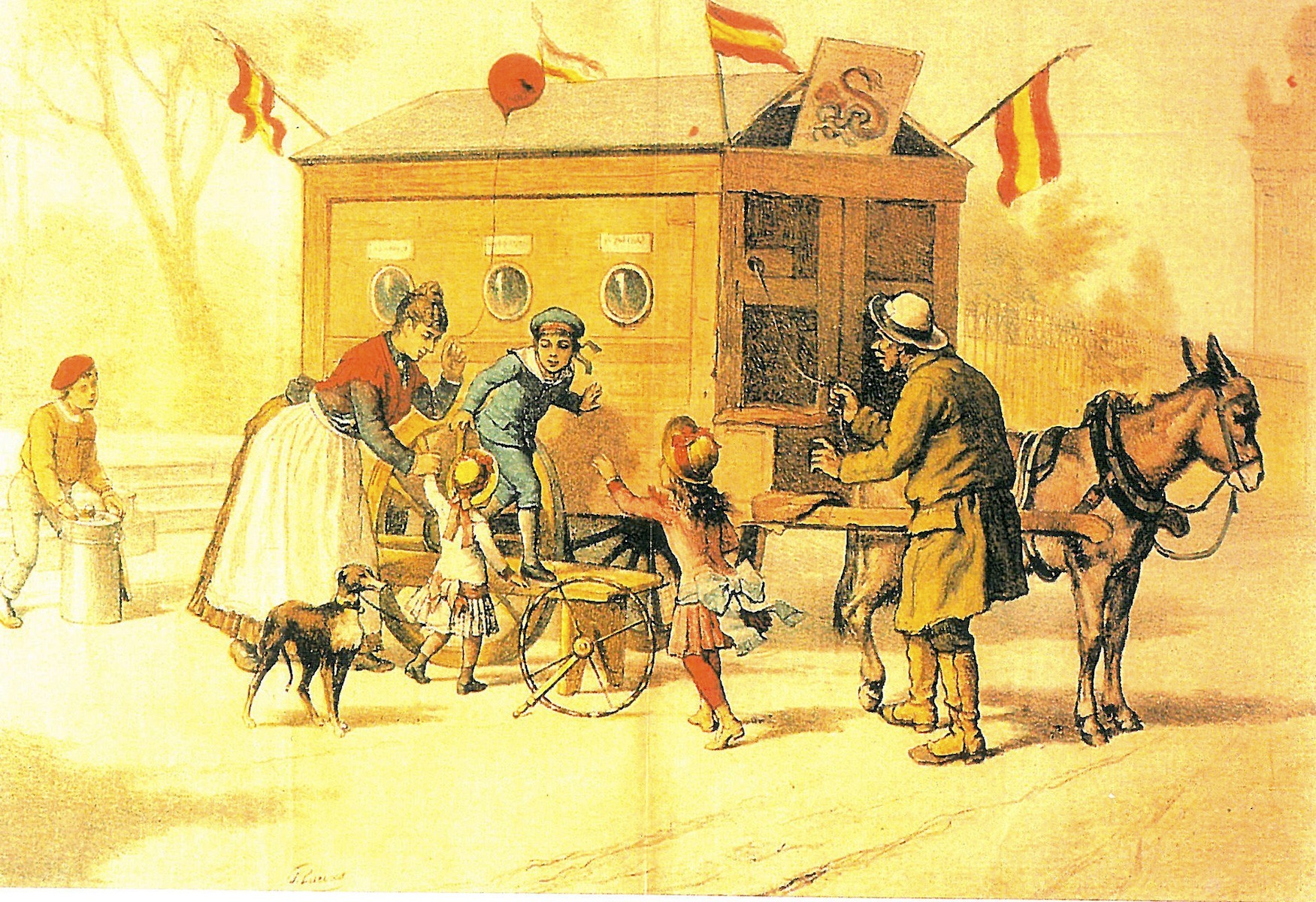 (Imatge destacada: Gravat d’un model de “mondo nuovo” itàlià dels segles XVIII-XIX, tirat per un carro; aquesta atracció visitava fires, pobles i mercats d’arreu d’Espanya.)