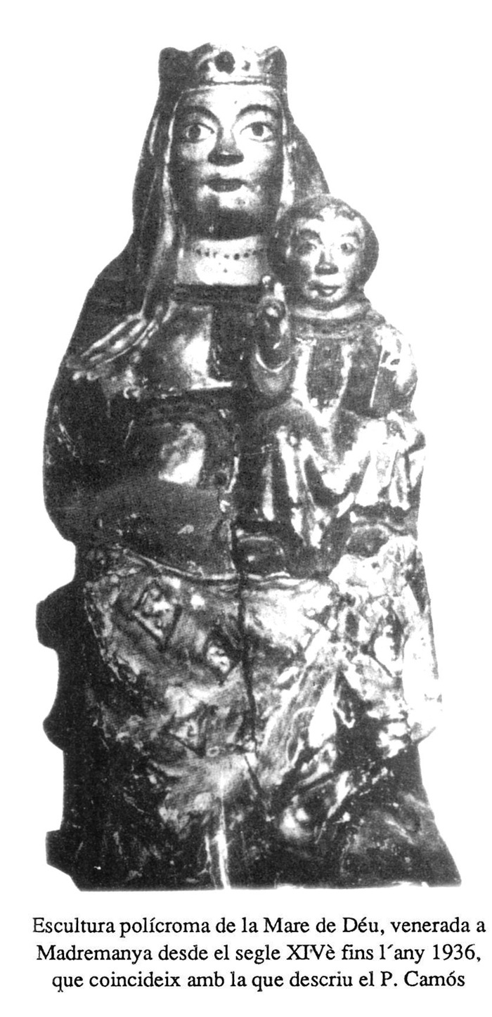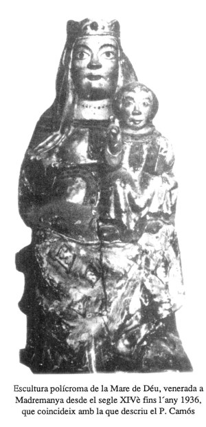 Les moltes vicissituds històriques patides pel santuari i les pèrdues d’elements artístics i religiosos ha fet que, a l’actualitat, la imatge que s’hi venera sigui una talla de l’escultor Josep Espelta de l’any 1943. Però una escultura de la Mare de Déu venerada al lloc proper de Madremanya, i del segle XIV, sembla que coincidia plenament amb aquesta descrita per Camós i que va veure en fer la visita.[2]