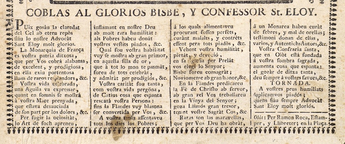De les “Coblas al gloriós bisbe y confessor St. Eloy” editades a Olot per Ramon Roca, estamper i llibreter en la plaça, se’n conserva -que sapiguem- un exemplar sense datar, de la fi del segle XVIII, a la Biblioteca de Catalunya, secció de goigs. N’hi ha també una reproducció facsímil en el llibre de Joan Baptista Batlle, Los goigs a Catalunya en lo segle XVIII,[1] que és el que hem tingut en consideració a l’hora de fer aquesta recerca. Al marge esquerre inferior del gravat hi llegim: “Roca”. El boix amb la imatge del sant, de 259 x 180/178 mm, va signat per “Rovira” i es pot atribuir a un dels dos impressors olotins de nom Josep Rovira, pare i fill. El pare fou també gravador.[2]