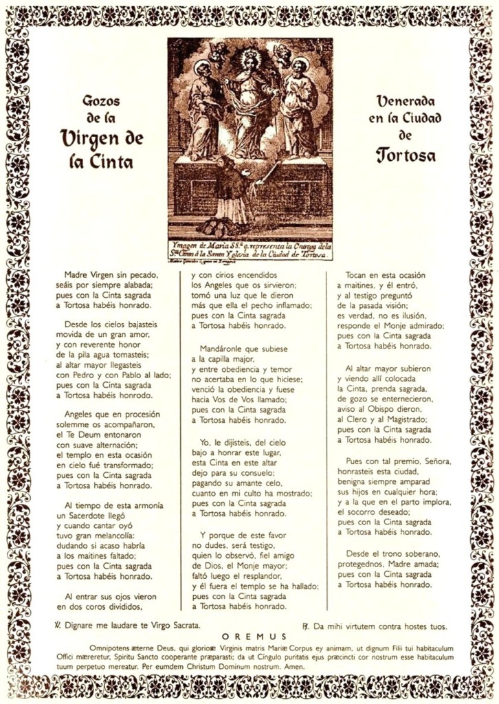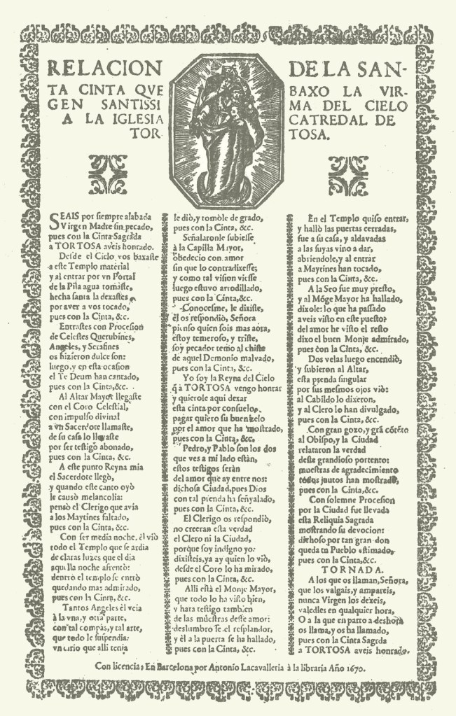 • Relacion de la Santa Cinta que baxó la Virgen Santissima del cielo a la Iglesia catedral de Tortosa. Barcelona: Antonio Lacavalleria, 1670. “Seais por siempre alabada / Virgen Madre sin pecado, / pues con la Cinta Sagrada / a TORTOSA aveis honrado.”