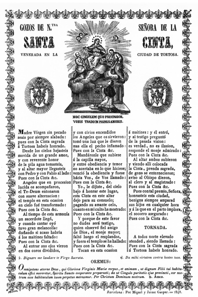 • Gozos de N.tra Señora de la Santa Cinta, venerada en la Ciudad de Tortosa. [Xilografia firmada:] Noguera. Barcelona: Miguel y Jaime Gaspar, 1848. “Madre Virgen sin pecado / seais por siempre alabada: / pues con la Cinta sagrada / á Tortosa habeis honrado.”