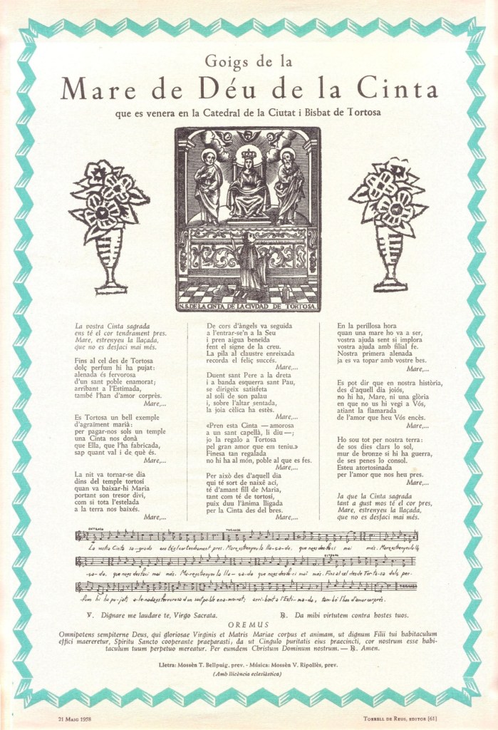 • Goigs de la Mare de Déu de la Cinta que es venera en la Catedral de la Ciutat i Bisbat de Tortosa. 1ª edició. Lletra: Mossèn T. Bellpuig. Música: Mossèn V. Ripollés. Barcelona: Torrell de Reus editor, 1958. [A dues tintes] (Jardí de Maria. Goigs de la Mare de Déu. Una devoció per cada dia del mes maig, 21 Maig) “La vostra Cinta sagrada / ens té el cor tendrament pres. / Mare, estrenyeu la llaçada, / que no es desfaci mai més.”