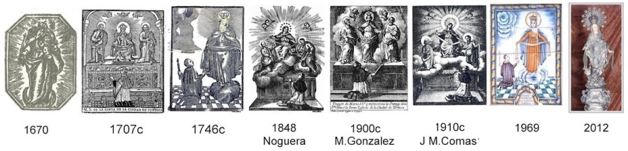 Al marge d’aquest cas trobem, que diversos artistes firmen alguns dels gravats de les moltes edicions del segle XIX: José Noguera estampa el seu nom als Gozos de 1848.[9] Mateo González escriu la seva firma en el magnífic gravat d’uns Gozos impresos a Tortosa per Algueró, sense data.[10] Més recentment, és l’obra de Josep Maria Comas que il·lustra i firma uns Gozos de 1910 impresos a Tortosa per Isuar.[11]