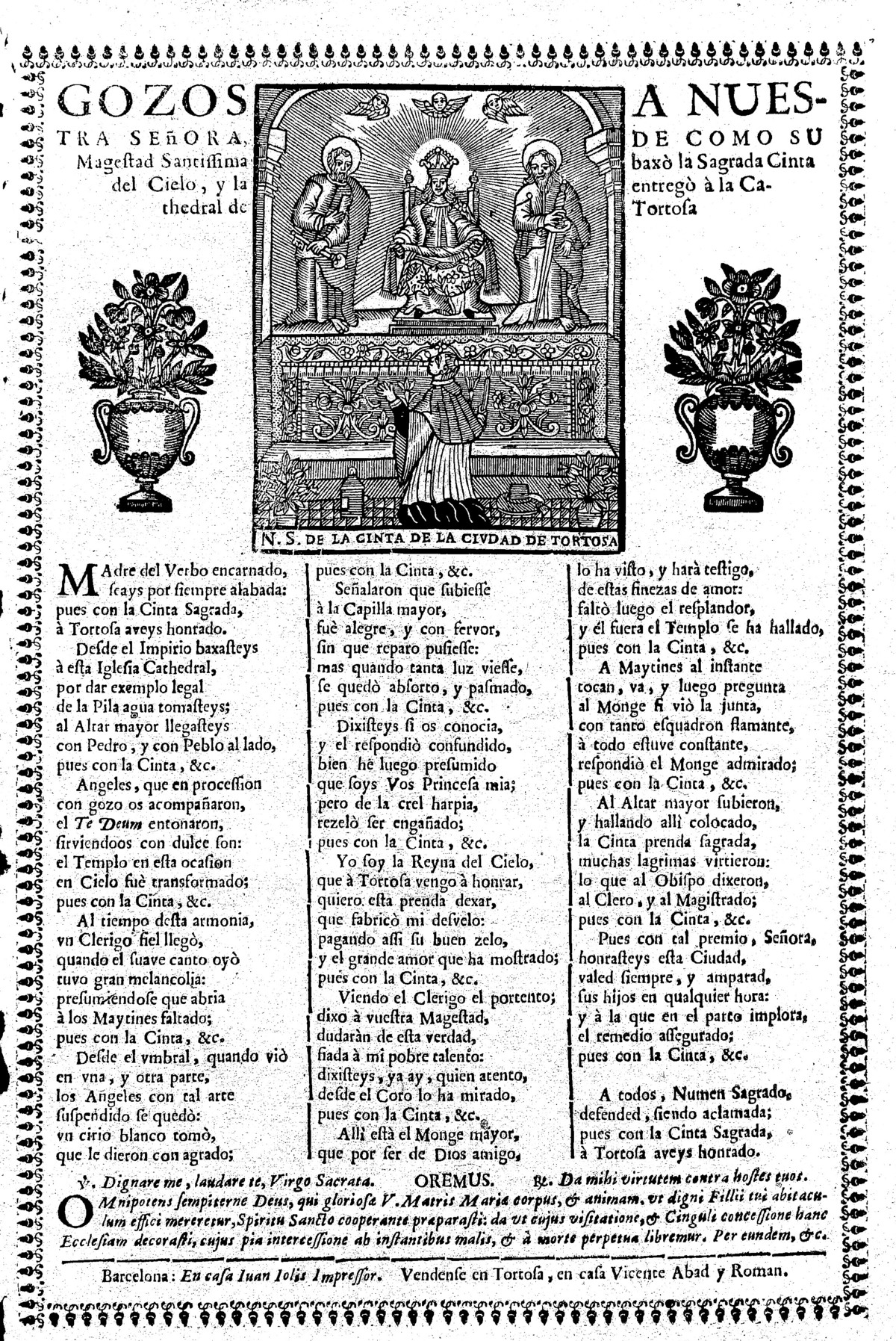 • Gozos a Nuestra Señora, de como su Magestad Santíssima baxò la Sagrada Cinta del Cielo, y la entregò á la Cathedral de Tortosa. Barcelona: Juan Jolis, impressor. Véndese en Tortosa, en casa de Vicente Abad y Roman. [1770 c.] “Madre del Verbo encarnado / seays por siempre alabada: / pues con la Cinta Sagrada, / à Tortosa aveys honrado.”