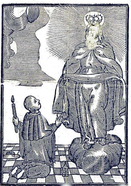 Però una curiosa excepció iconogràfica es troba en l’edició d’uns Gozos fets al segle XVIII a Barcelona, a la impremta dels hereus de Bartholomé i Maria Angela Giralt en el carrer de S. Cayetano (1746-1800 c.), on apareix la Verge amb la Cinta i el clergue agenollat amb el ciri, fora de l’altar, en un expressiu dibuix. No tornarà a repetir-se el gravat fins que l’impressor Miquel Solé-Boyls l’estamparà a Barcelona en uns Goigs seus d’edició numerada de 1926. A. Aragonés copia aquest gravat en “Un poema visual” que interpreta amb ironia.[8]