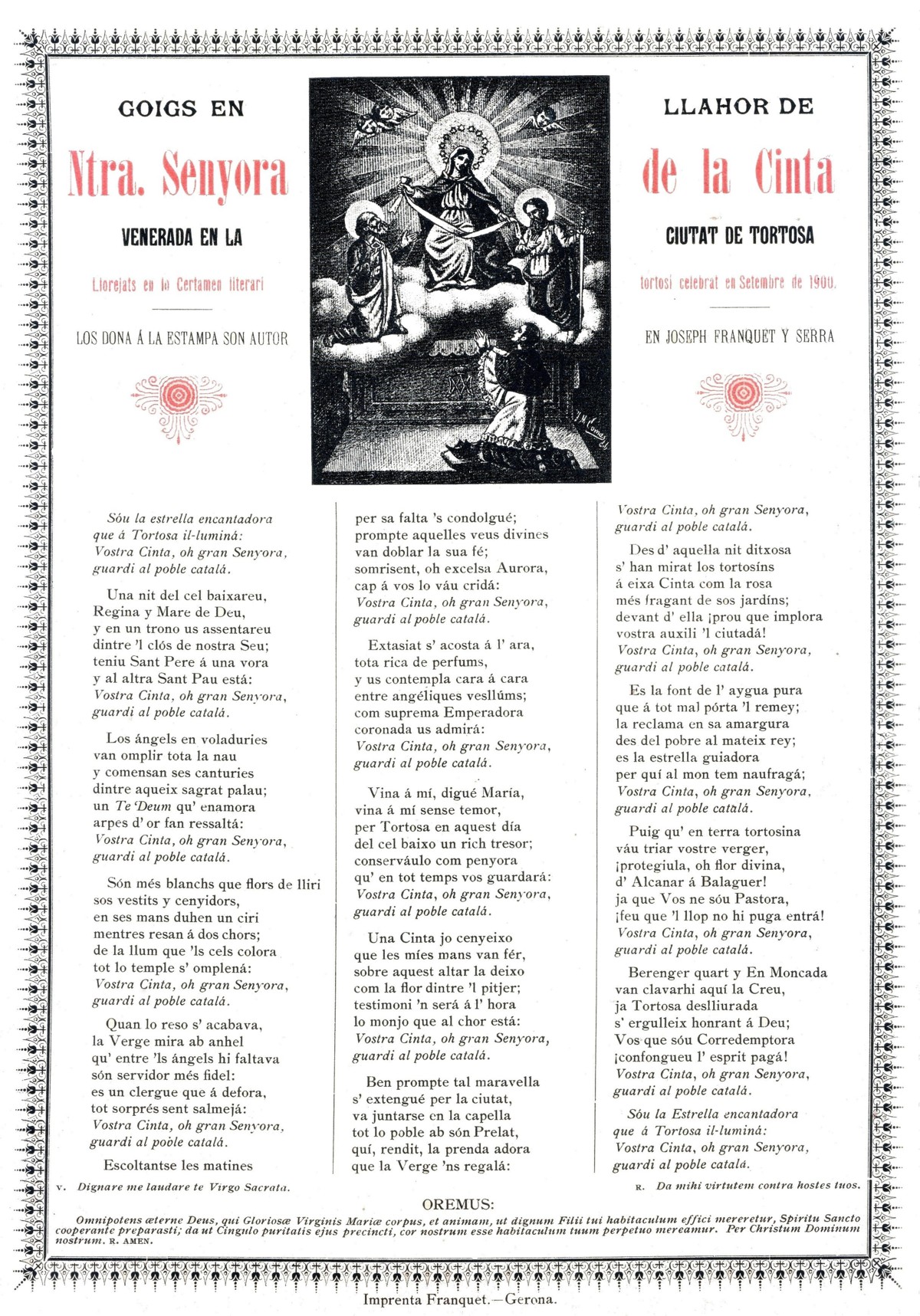 • Goigs en llahor de Ntra. Senyora de la Cinta venerada en la ciutat de Tortosa. Llorejats en lo Certamen literari tortosí celebrat en Setembre de 1900. Los dona á la estampa son autor en Joseph Franquet y Serra. Gerona: Imprenta Franquet, s. a. [A dues tintes]. “Sóu la estrella encantadora / que á Tortosa il·luminá: / Vostra Cinta, oh gran Senyora, / guardi al poble català.”
