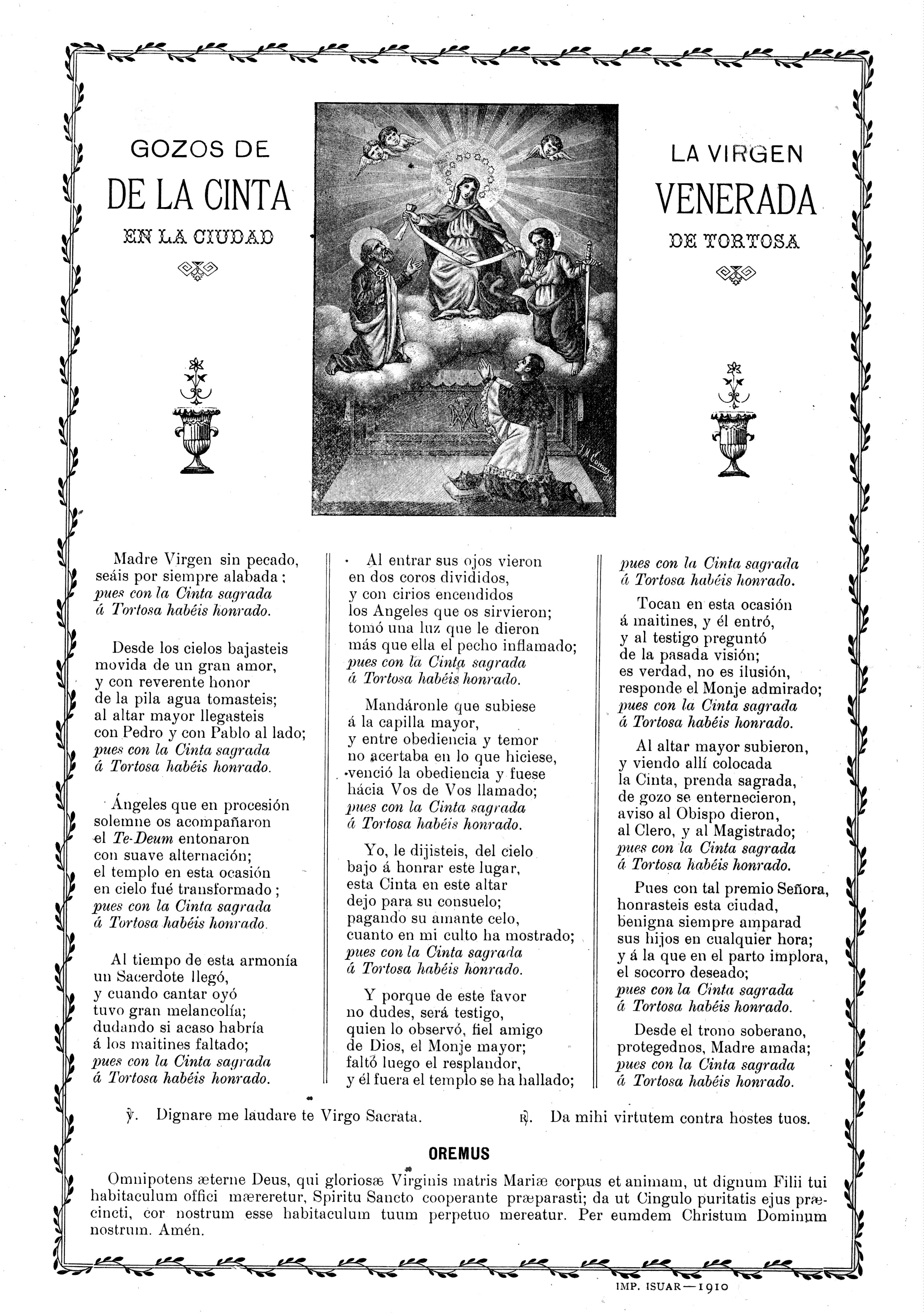 • Gozos de la Virgen de la Cinta venerada en la Ciudad de Tortosa. [Tortosa]: Imp. de S. Isuar, 1873. “Madre Virgen sin pecado, / seais por siempre alabada: / Pues con la Cinta sagrada / á Tortosa habeis honrado.”