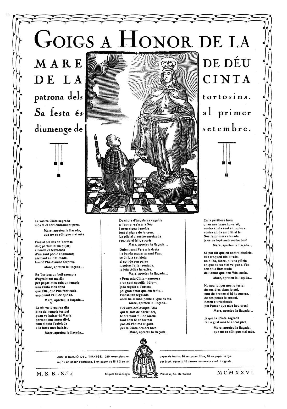 • Goigs a Honor de la Mare de Déu de la Cinta patrona dels tortosins. Sa festa és al primer diumenge de setembre. Barcelona: Miquel Solé-Boyls, MCMXXVII. (M.S.B.- Nº 4) [Xilografia del segle XVIII]. “La vostra Cinta sagrada / mos té el cor tendrament pres. / Mare, apreteu la llaçada, / que no es sòltigue mai més.”