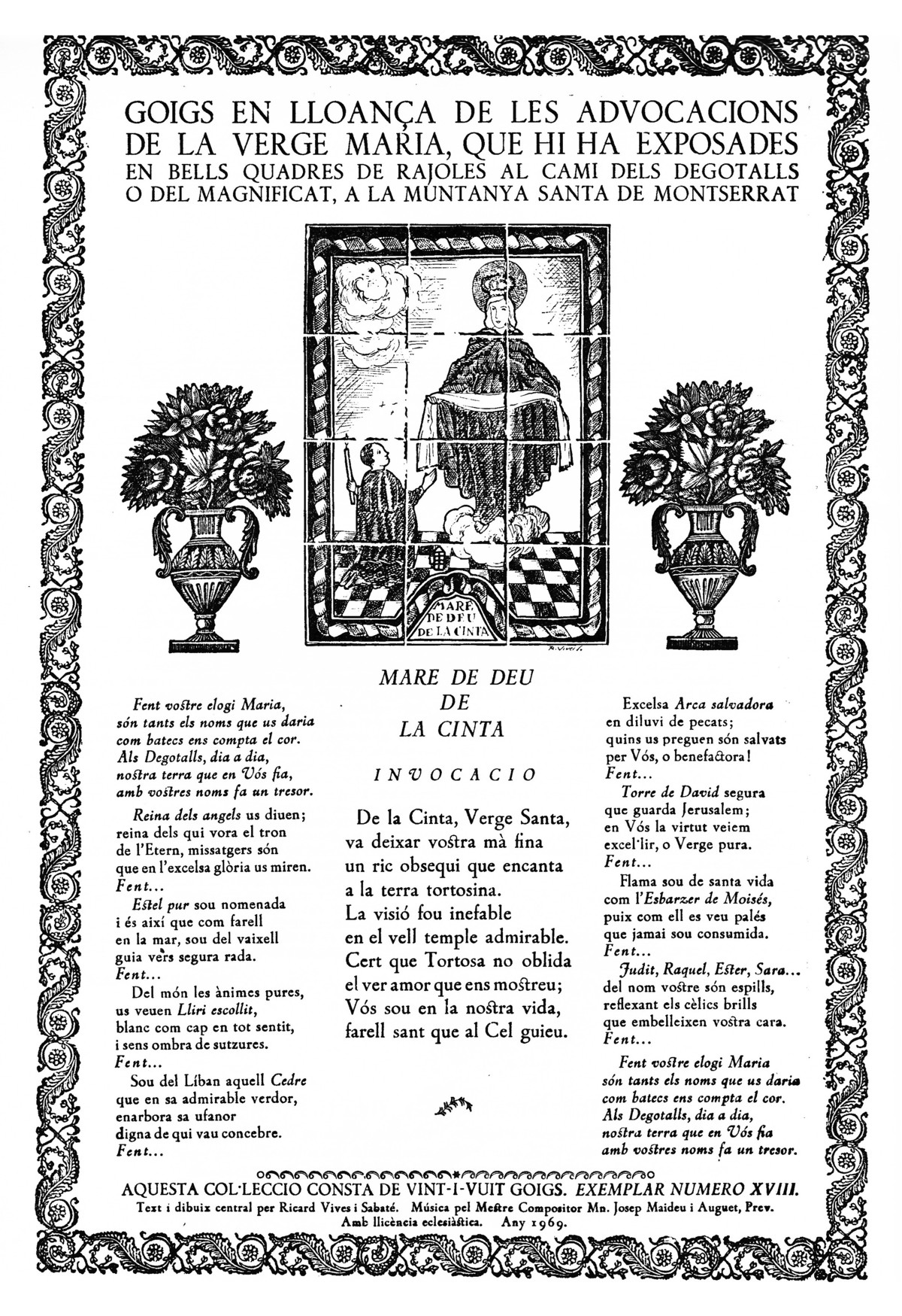 • Goigs en lloança de les advocacions de la Verge Maria, que hi ha exposades en bells quadres de rajoles al camí dels degotalls o del Magníficat, a la muntanya santa de Montserrat. Mare de Déu de la Cinta INVOCACIÓ. Text i dibuix central per Ricard Vives i Sabaté. Música pel Mestre Compositor Mn. Josep Maideu i Auget, 1969. (Exemplar número XVIII.) “De la Cinta, Verge Santa, / va deixar vostra mà fina / un ric obsequi que encanta / a la terra tortosina.”