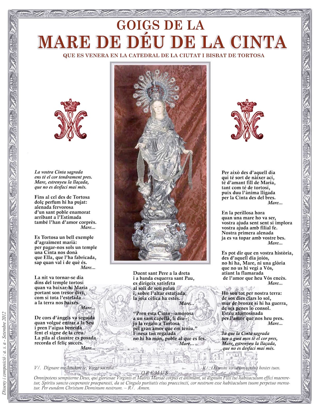 • Goigs de la Mare de Déu de la Cinta que es venera en la catedral de la ciutat de Tortosa. Disseny i composició: A[ntoni] S[abat] A[guilera] – Setembre 2012. Edició policromada electrònica. “La vostra Cinta sagrada / ens té el cor tendrament pres. / Mare, estrenyeu la llaçada, / que no es desfaci mai més.” Theotokos [blog] [consulta 31/5/2019]