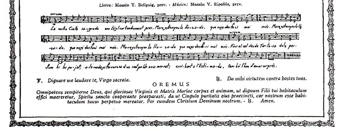 La partitura musical de mossèn V. Ripollès apareix aplicada a la lletra de Tomàs Bellpuig dels goigs de la Cinta en diversos fulls de goigs del segle XX, no sempre datats però atribuïts a l’any 1932 com a data més antiga i consignada també en edicions posteriors.[14]