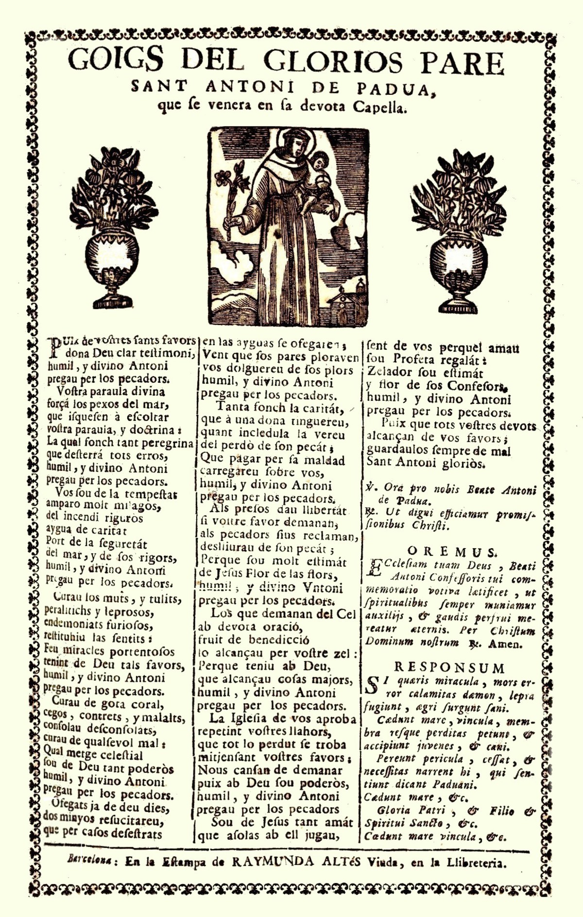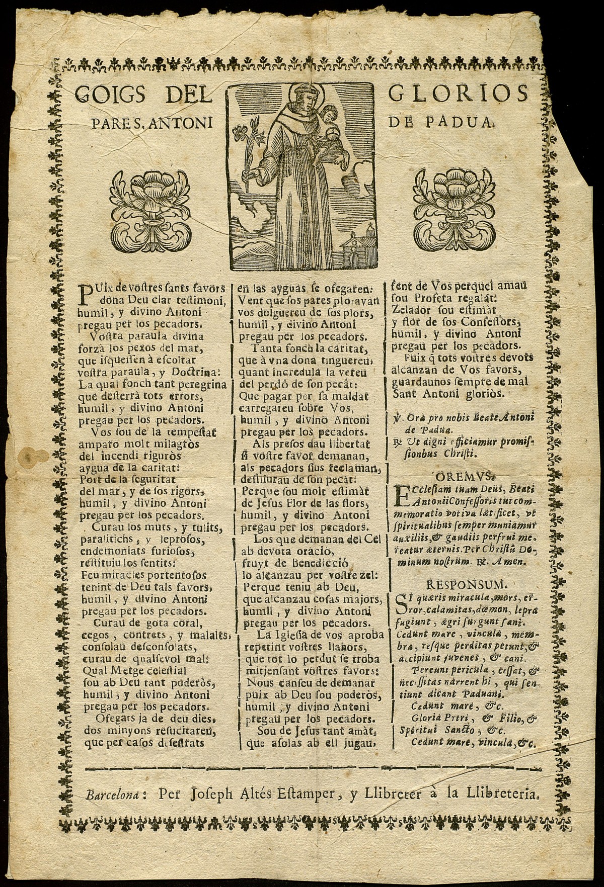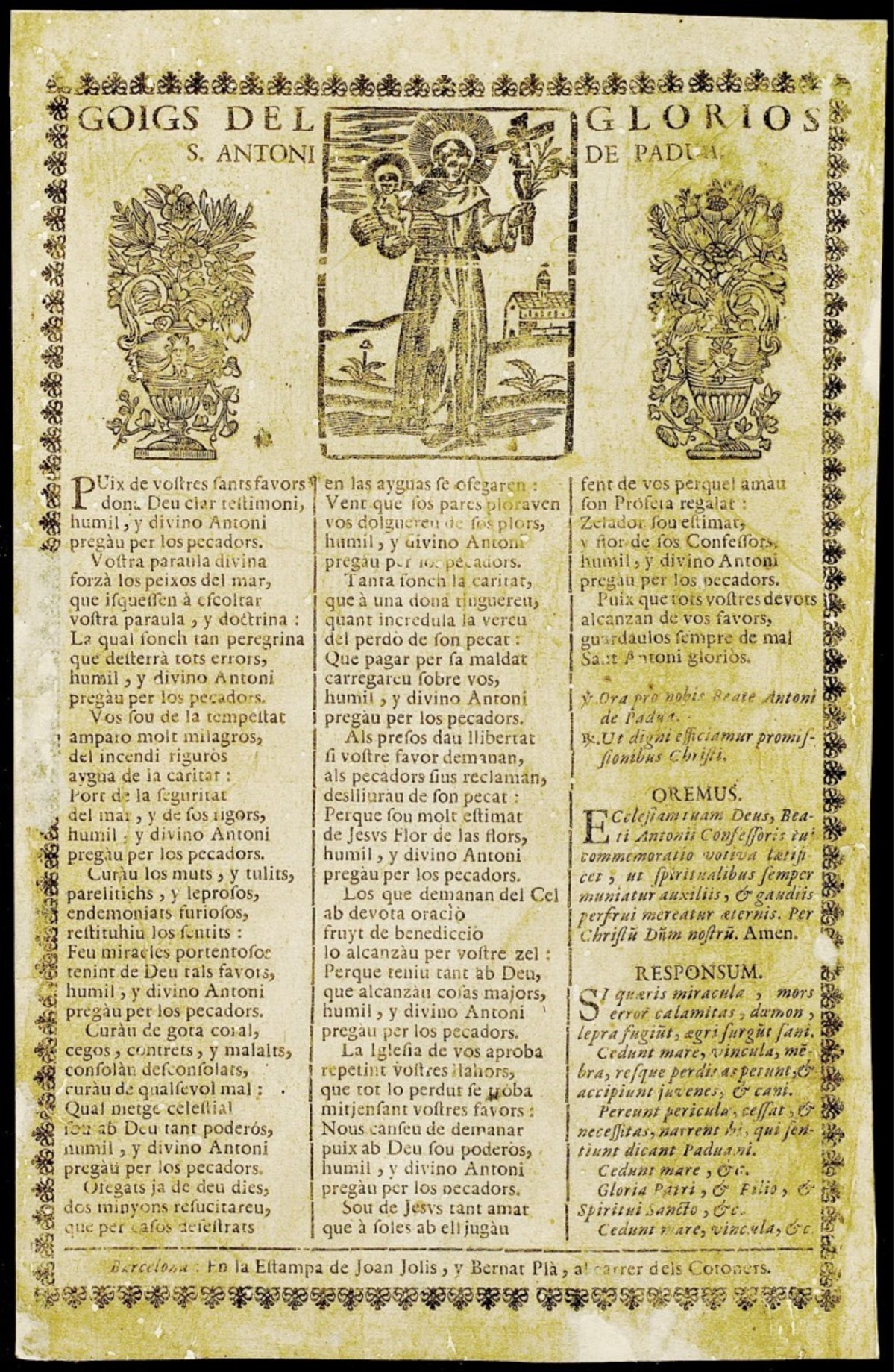 Excepcionalment, en el món dels fulls de goigs, apareix copiat i inclòs a la columna de la dreta un Responsum poètic reconegut internacionalment com l’Officium rhythmicum S. Antonii (c. 1233) de fra Giuliano de Spira (segle XIII), que comença: “Si quaeris miracula […]”. Es tractava d’un respons en llatí que oficiants i fidels cantaven alternativament per trobar objectes perduts i que era molt popular.[8]