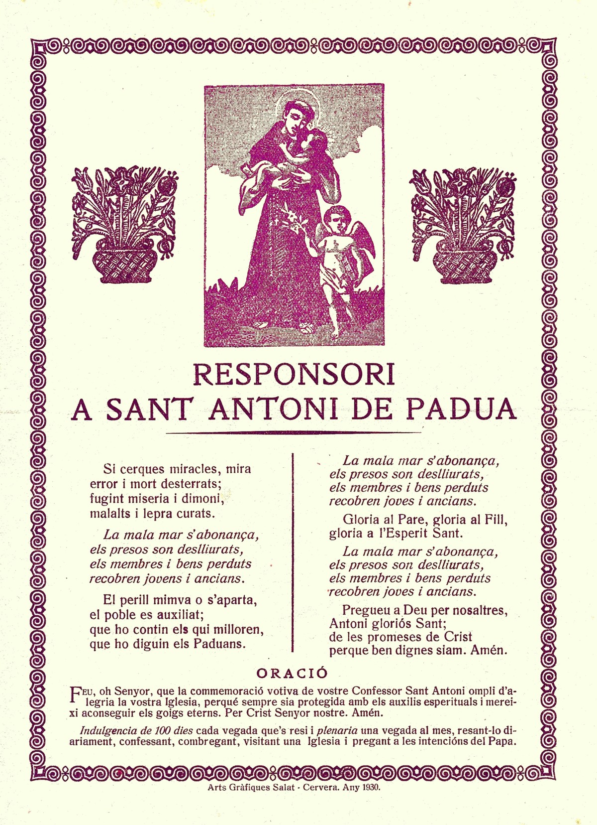 [10] Responsori a Sant Antoni de Padua. Cervera: Arts Gràfiques Salat, any 1930. 1 f. (Exemplar de l’arxiu dels Amics dels Goigs).