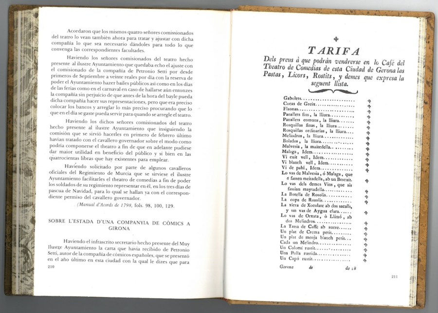 En una data ja un xic llunyana (1983) vam publicar una “Tarifa dels preus a què podran vendrer-se en lo café del Theatro de Comedias de esta ciudad de Gerona las pastas, licors, rostits y demés que expresa la següent llista” dins d’una història dedicada al teatre a Girona.[1] Era un full imprès, d’inicis o mitjan segle XIX, que només indicava els dos primers dígits (“18”) de la centúria. Aquest efímer ens va permetre conèixer què es podia menjar i beure, degustar en el cafè del Teatre de Comèdies de Girona als inicis, als entreactes o a la fi dels nombrosos saraus, comèdies, òperes que s’hi representaven. L’oferta era prou abundant i variada, a fe de Déu que t’hi podies atipar, sortir fet un bon xitxarel·lo. Aquesta espai de lleure avui encara existeix, potser no en el mateix lloc, ni situació. Ben segur que l’edifici ha sofert moltes i moltes intervencions arquitectòniques al llarg de gairebé dos-cents anys i escaig. L’oferta actual és, però, molt més modesta: cafè, entrepans, bosses de patates, llaminadures, quatre begudes, poquetes cosetes més, etc.