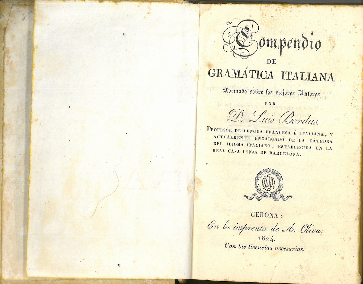 Es tracta del Compendio de gramática italiana formado sobre los mejores autores de Lluís Bordas, impresa per Antoni Oliva (1824, 228 pàgines).[1] En el llibre no hi ha ni una sola referència a la llengua catalana, al català. Bordas, de fet, ho era. La castellanització de les esferes culturals a inicis del segle XIX era majúscula. Antoni Oliva fou un llibreter i impressor molt exigent i perfeccionista que treballava al carrer de les Ballesteries de Girona. La producció d’aquesta llarga família d’impressors ha estat estudiada per Enric Mirambell a la seva Història de la impremta a Girona (Ajuntament; Institut d’Estudis Gironins, 1988) en un moment en què encara no existien les xarxes socials ni els inventaris informatitzats. De fet, aquell llibre no surt en aquest valuós estudi. Resten potser encara per establir les connexions entre les famílies d’impressors Oliva de Girona i de Barcelona. L’any 1826 s’imprimia, per exemple, a Barcelona, una coedició entre les dues branques: Arte poética fácil: diálogos familiares en que se enseña la poesía a cualquiera de mediano talento, de cualquiera sexo y edad. Obra de Juan Francisco de Masdeu. Nueva edición corregida con esmero y puesta en un todo conforme á la nueva ortografía por D.J.M.P. y C., Gerona: Antonio Oliva; Barcelona: Librería de Oliva, 1826. A Barcelona tenien llibreria al carrer de l’Argenteria.