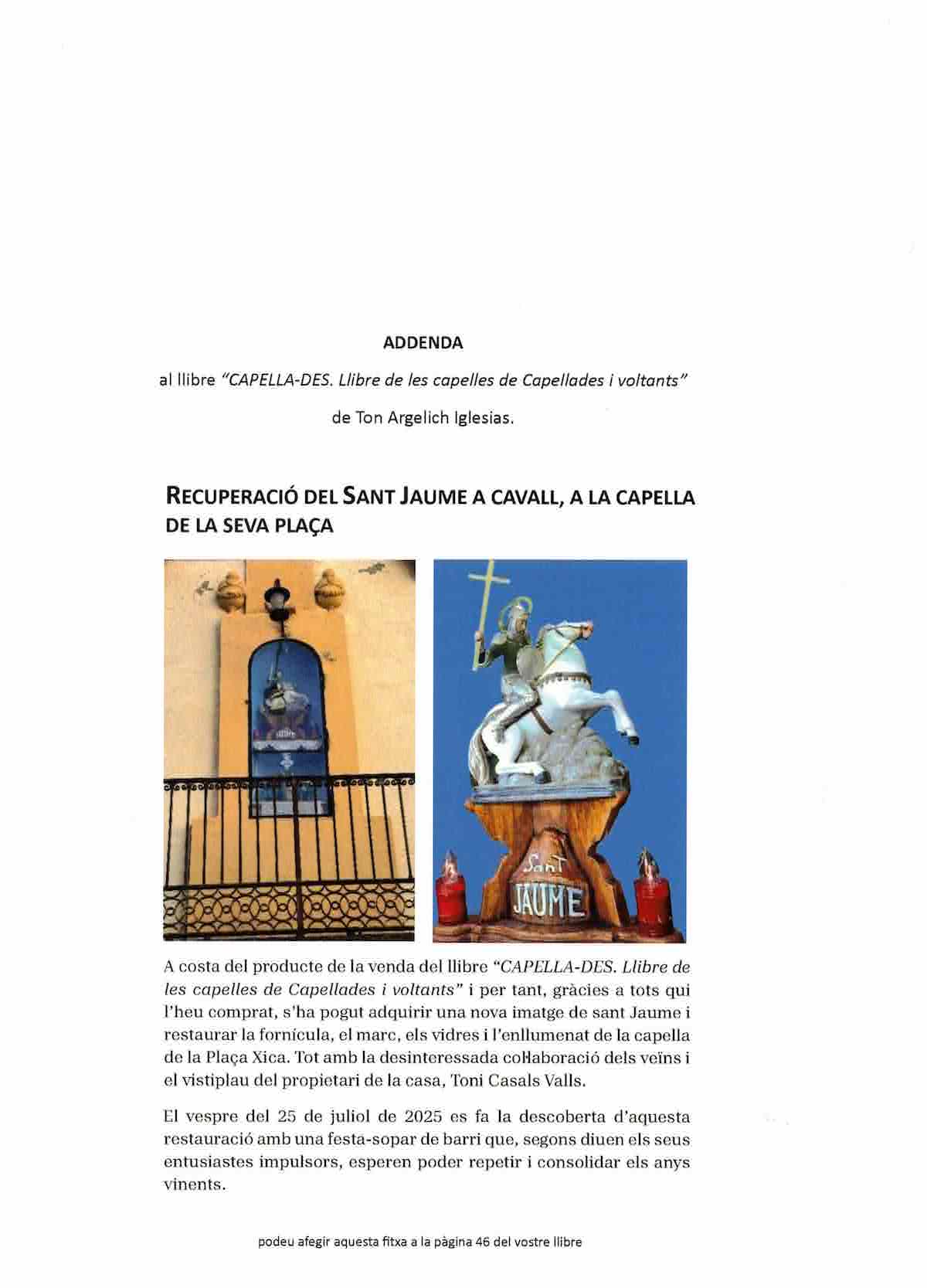 A la p. 45 del llibre es dedica un apartat a la capella buida de la plaça de Sant Jaume. Des del passat 25 de juliol de 2025, dia del sant, la capella ja té imatge. La tradició segueix viva.